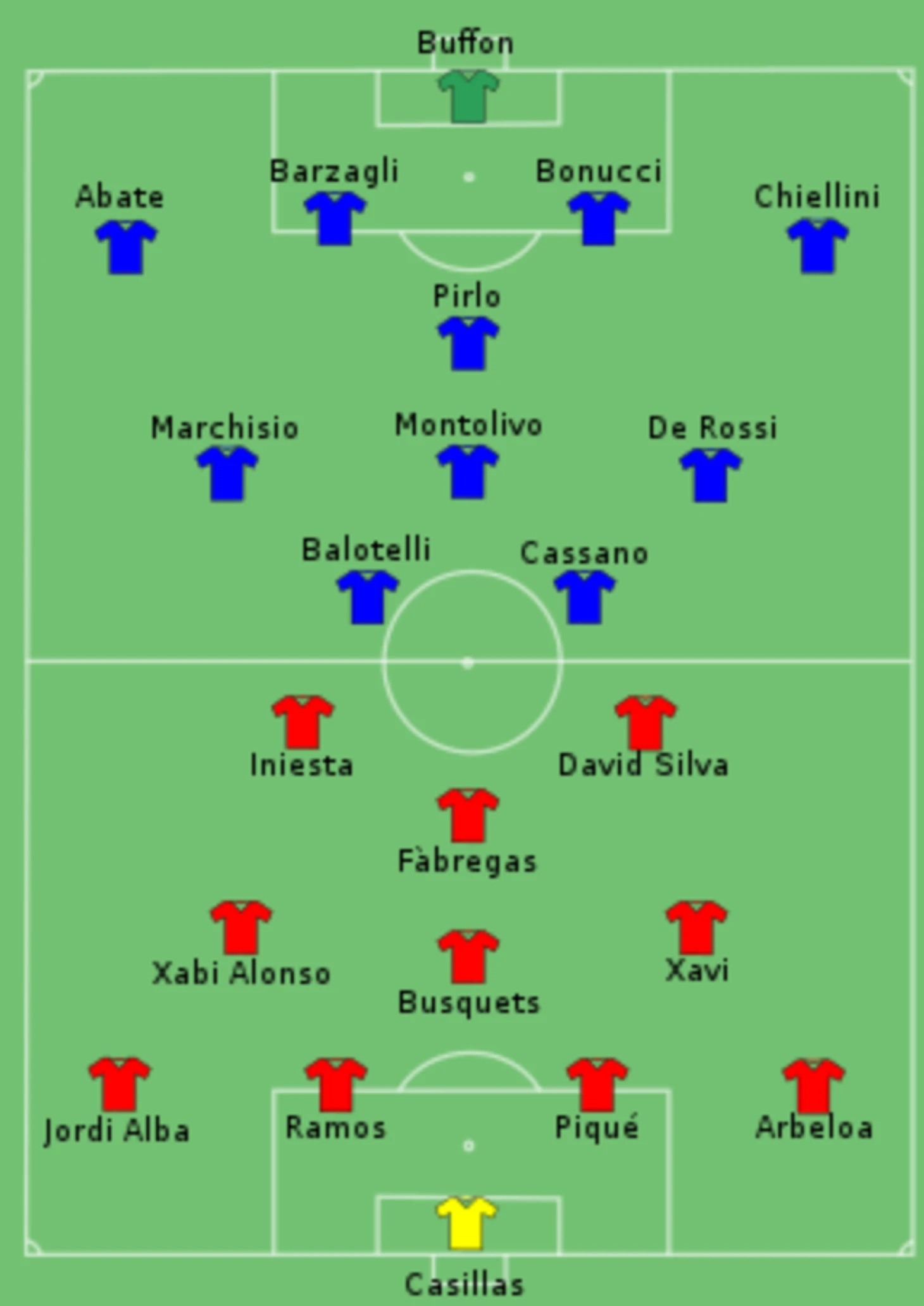 Первый гол был забит на 15 минуте : Иньеста отдаёт пас в разрез , увидев забегающего Фабрегаса , затем Сеск прорывается в штрафную , простреливает и Давид Сильва с головы открывает счёт в матче . Итальянцы пытались отыграться , создавали неплохие контр-атаки , но не получалось вскрыть оборону испанцев .