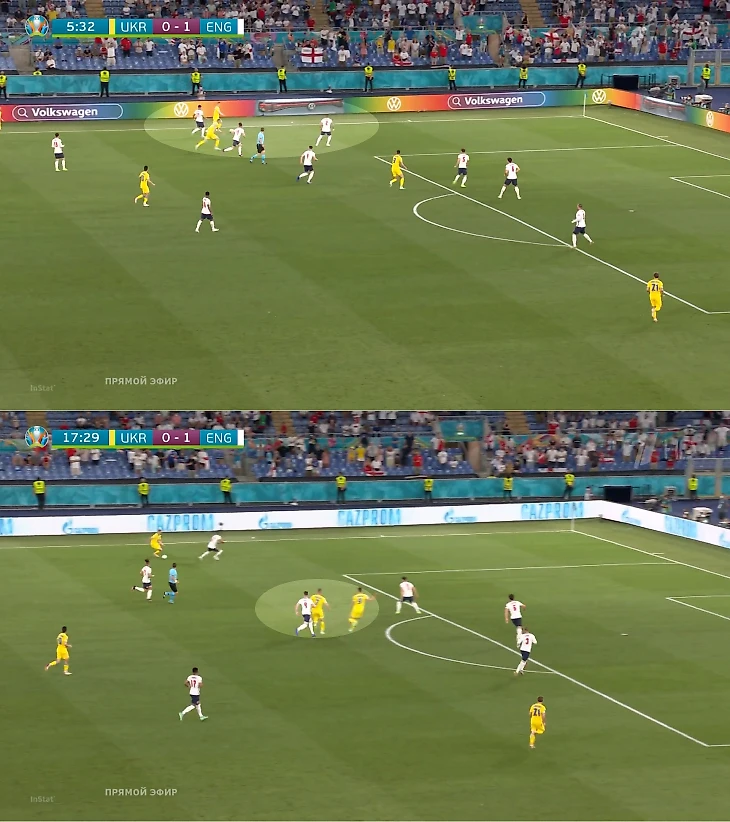 В первом тайме было три таких эпизода. Если бы Украина встречала Англию выше и чаще, разрывы были мощнее.