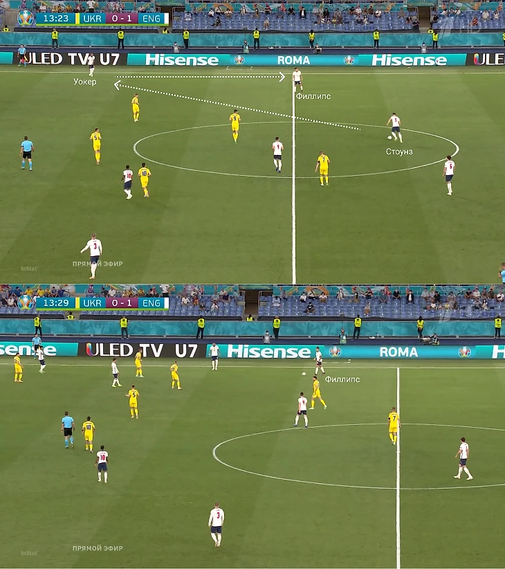 Стоунз и Магуайр пасовались между собой, затем замечали вариант на фланге (Караваев и Миколенко не встречали защитников высоко). Здесь Уокер покатил мяч Филлипсу, тот пять секунд стоял, выбирая варианты. Его никто не встретил, поэтому во имя сохранения контроля он отдал назад Стоунзу.