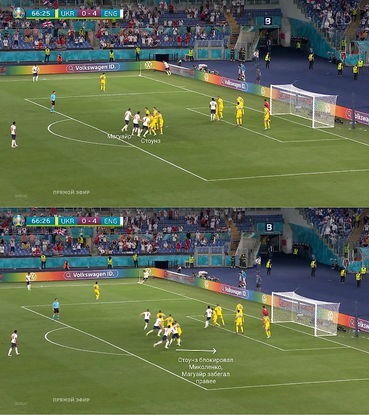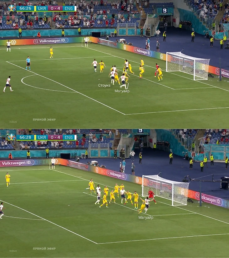 Харри дважды оставался чуть позади. Когда пробивал сам, помог блок от партнера: Стоунз взял крайнего правого оппонента (Миколенко) и поставил заслон. Магуайр этим воспользовался и забежал справа, оторвавшись от Матвиенко.