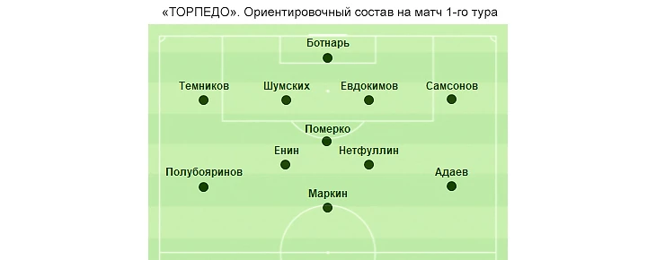По сравнению с предыдущим сезоном существенных перемен в расстановке «Торпедо», по всей вероятности, не предвидится. Судя по контрольным матчам, поклонников клуба ожидает та же игра в четыре защитника с одним нападающим. Вариаций стоит ждать только в отношении расположения тройки центральных полузащитников. Первый вариант – ярко выраженный опорник и два хавбека с уклоном в атаку перед ним, которые активно поддерживают выдвинутого вперед форварда. Второй – два полузащитника, ориентированных на оборону и один полузащитник атакующего плана, помогающий единственному нападающему.