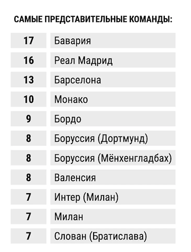 Бавария, 17: 1972 - Герд Мюллер, Зепп Майер, Пауль Брайтнер, Ули Хёнесс, Франц Беккенбауэр, Ханс-Георг Шварценбек (Германия); 1980 - Вальтер Юнгханс, Карл-Хайнц Румменигге (Германия); 1992- Бриан Лаудруп (Дания); 1996 - Кристиан Циге, Маркус Баббель, Мехмет Шолль, Оливер Кан, Томас Хельмер, Томас Штрунц, Юрген Клинсман (Германия); 2000 - Биксант Лизаразю (Франция)