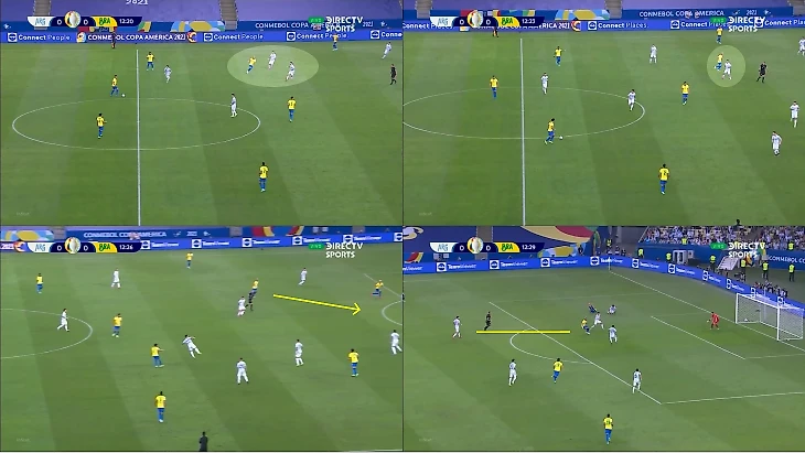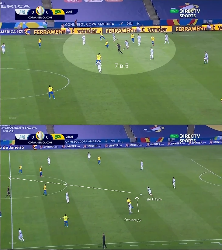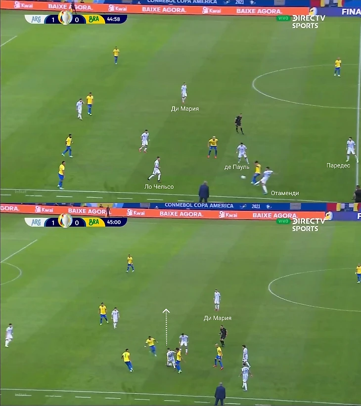 У таких принципов был бонус – возможность задавить количеством и убежать в контратаку. В этой ситуации Аргентина поджала Бразилию на ауте: Отаменди выбросился очень высоко – его страховал Паредес, де Пауль и Ло Чельсо действовали на фланге, Анхель сместился к ним. Аргентина отобрала мяч, затем нашла легкое и быстрое продолжение.