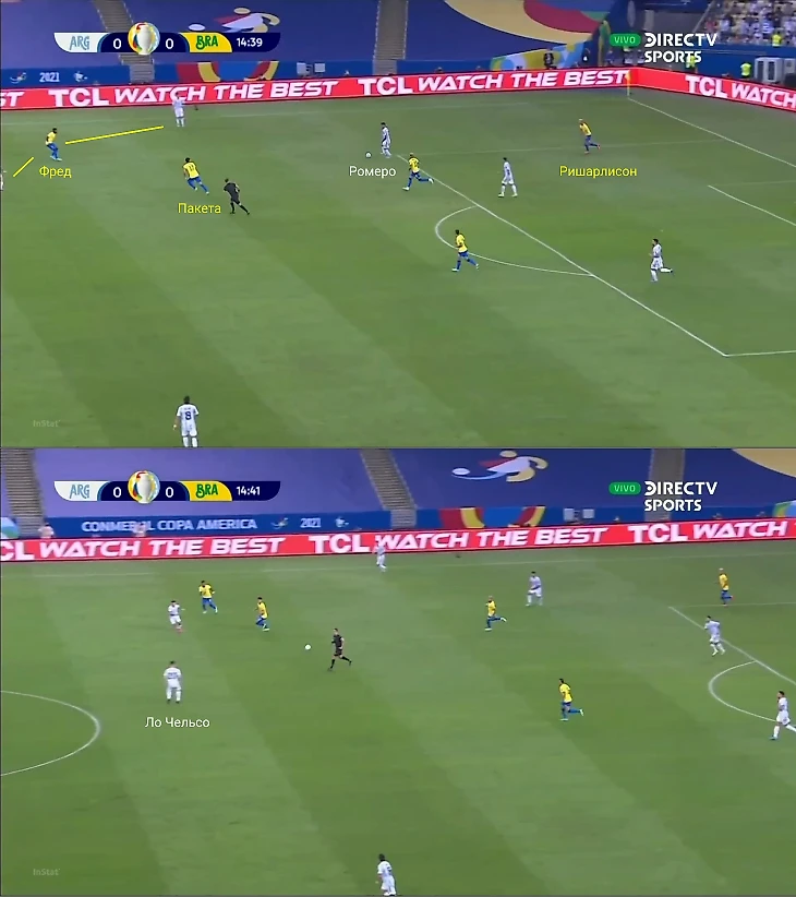 В матче был пример, который собрал все эти тезисы в одной атаке (плюс проблемы Аргентины). Ромеро чуть не привез гол, странно обработав мяч, но Ришарлисон провалился, и левый фланг Бразилии просел. Туда направился Фред, который опекал де Пауля.