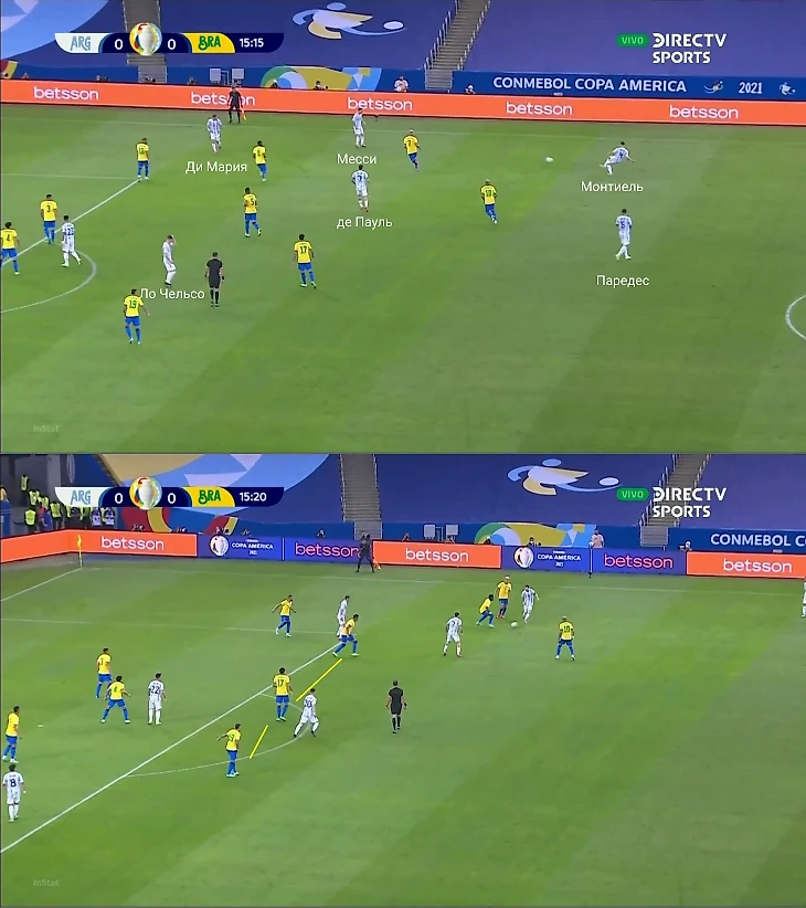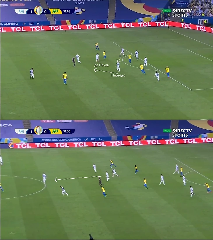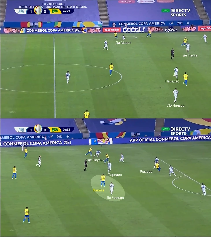После перевода Аргентина перетекла направо: Ди Мария бросился встречать Фреда. Бразилец отрезал полузащитника передачей, но Аргентина лишила соперника пространство через подстраховку. К эпизоду выдвинулся де Пауль, Паредес оперативно вернулся в опорную зону, а Ло Чельсо сместился в середину, подобрав Пакета. В итоге атака захлебнулась из-за компактности и неточной передачи, которую подобрал Ромеро.