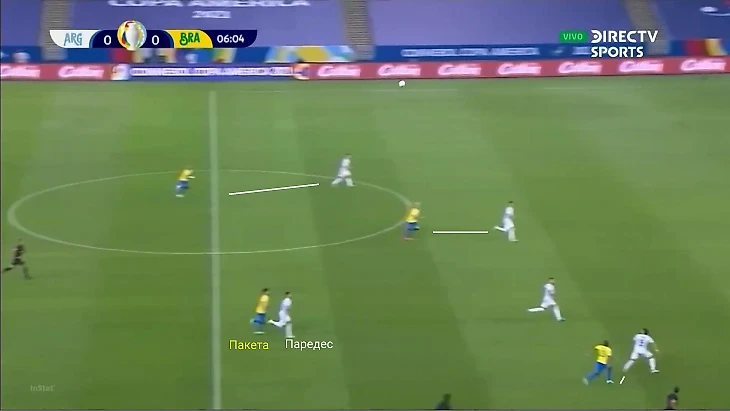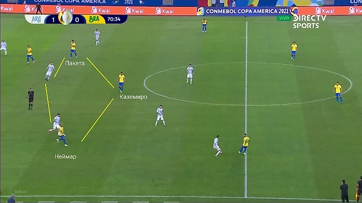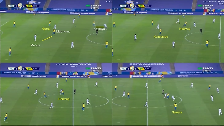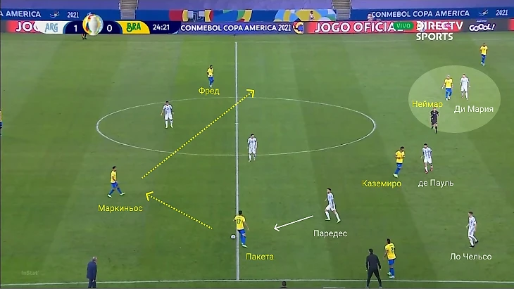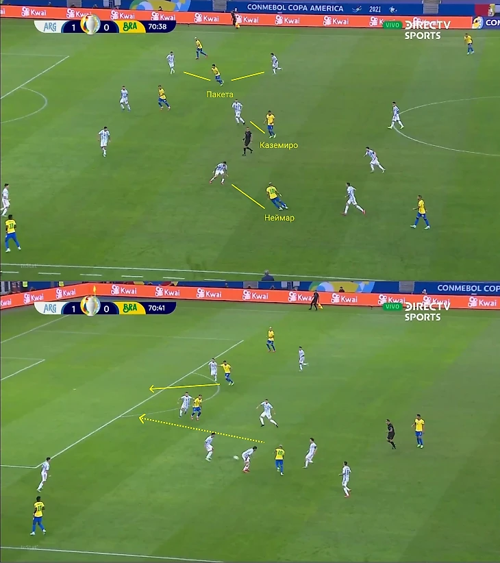 В этом эпизоде помог Ди Мария: Паредес поднялся к Пакета, де Пауль страховал смещение Каземиро, а Анхель сместился ближе к центру, чтобы бразильцы не нашли Неймара. Пакета отдал Маркиньосу, а он перевел налево.