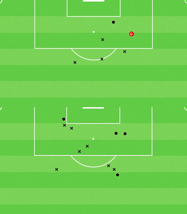 Ниже – карта ударов, на которой наглядно показано, что Бразилия лучше создавала себе условия для моментов. Сверху – удары Аргентины, снизу – Бразилии.