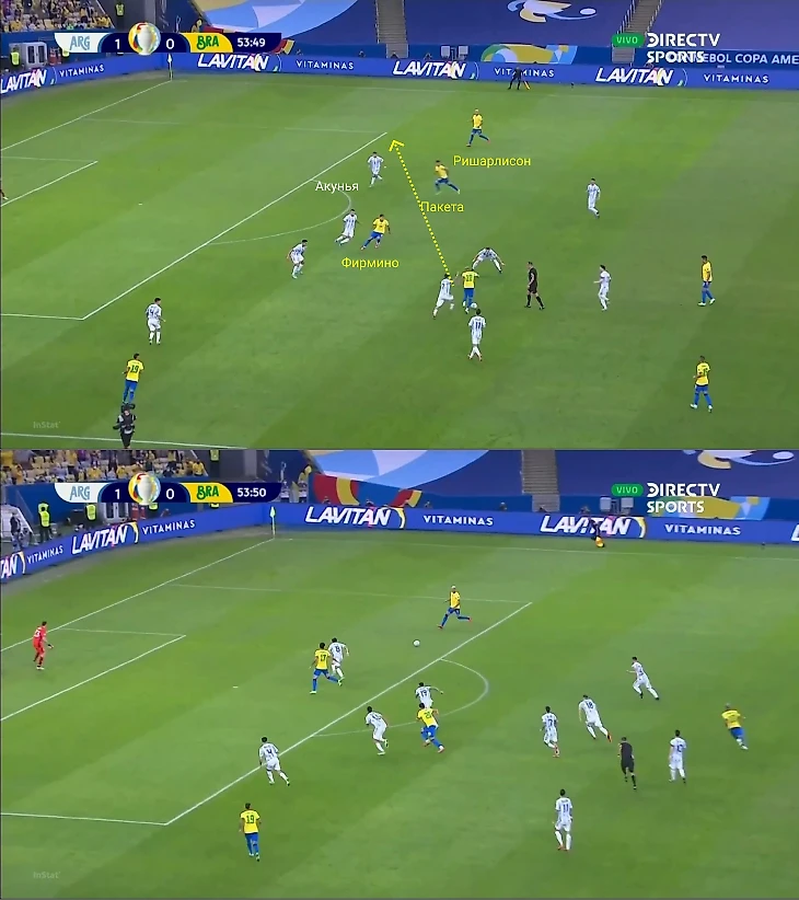 Классный пример: Ней сместился правее, Фирмино был в центре около Отманди, поэтому Пакета отвлек внимание Акуньи, освободив пространство для Ришарлисона. Неймар покатил на свободного вингера, и Мартинесу пришлось спасать Аргентину.