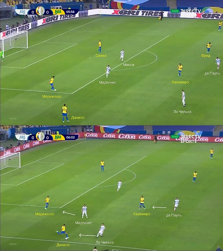 5. Теперь к примерам. Прессинг Аргентины: присутствие Месси и Лаутаро вынуждало Бразилию переводить игру на фланги. Плюс Ло Чельсо очень редко играл персонально по Данило, позволяя защитникам находить его передачей.
