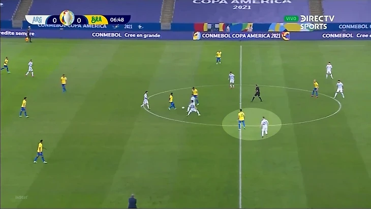 6. После гола Аргентина откатилась чуть глубже, встречая Бразилию в районе центрального круга. Здесь стоит похвалить четверку полузащитников – они хорошо ориентировались в разных ситуациях и страховали друг друга. Это стало ключевым моментом надежности в первом тайме. По сути, Месси и Лаутаро (в меньшей степени) не источали агрессию при позиционной обороне, позволяя Бразилии владеть мячом в районе центрального круга.