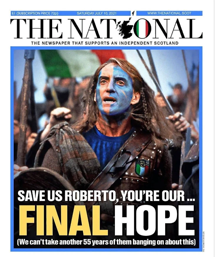 Газета The National (она открыто декларирует поддержку независимости Шотландии от Лондона) публикует на первой странице фото тренера сборной Италии Роберто Манчини в образе Уильяма Уоллеса (воевавшего с англичанами народного героя Шотландии, которого сыграл Гибсон в фильме «Храброе сердце»).