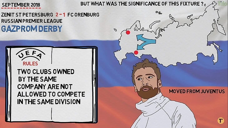 "Зенит" и "Оренбург" фактически принадлежат одной компании, но в связи с умными действиями, нацеленным на формальный уход из-под действия вышеозначенного правила, реструктуризации долей владения компании, они в рамках закона играли в одной лиге. Те, кто знаком с Лигой Чемпионов, не раз слышал и видел рекламу "Газпрома", с 2012 года, когда компания заключила сделку с ФИФА.