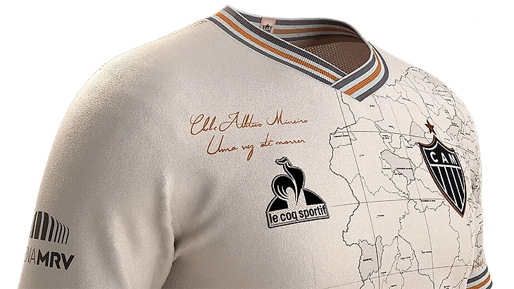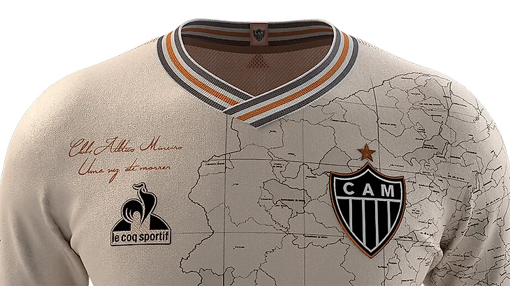Форма выполнена в бежевом цвете – с серыми, оранжевыми и белыми деталями на манжетах и воротнике. Главная деталь – на футболке отражена подробная карта штата Минас-Жерайс. Символ того, что клуб из Белу-Оризонти представляет весь регион.