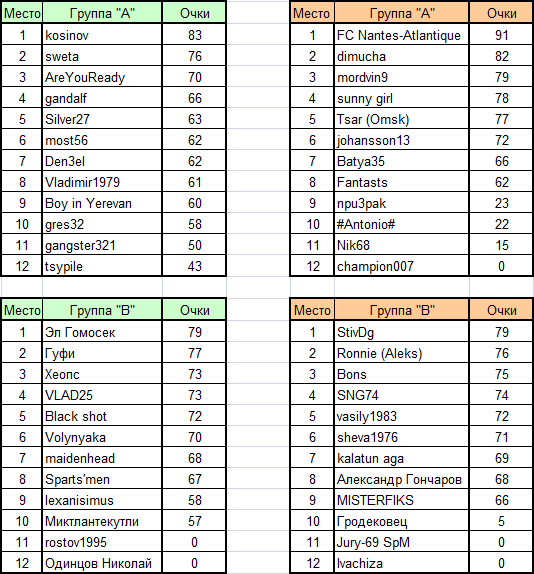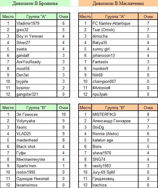 Турнирное положение после 15-ти сыгранных туров в группах и Дивизионах: