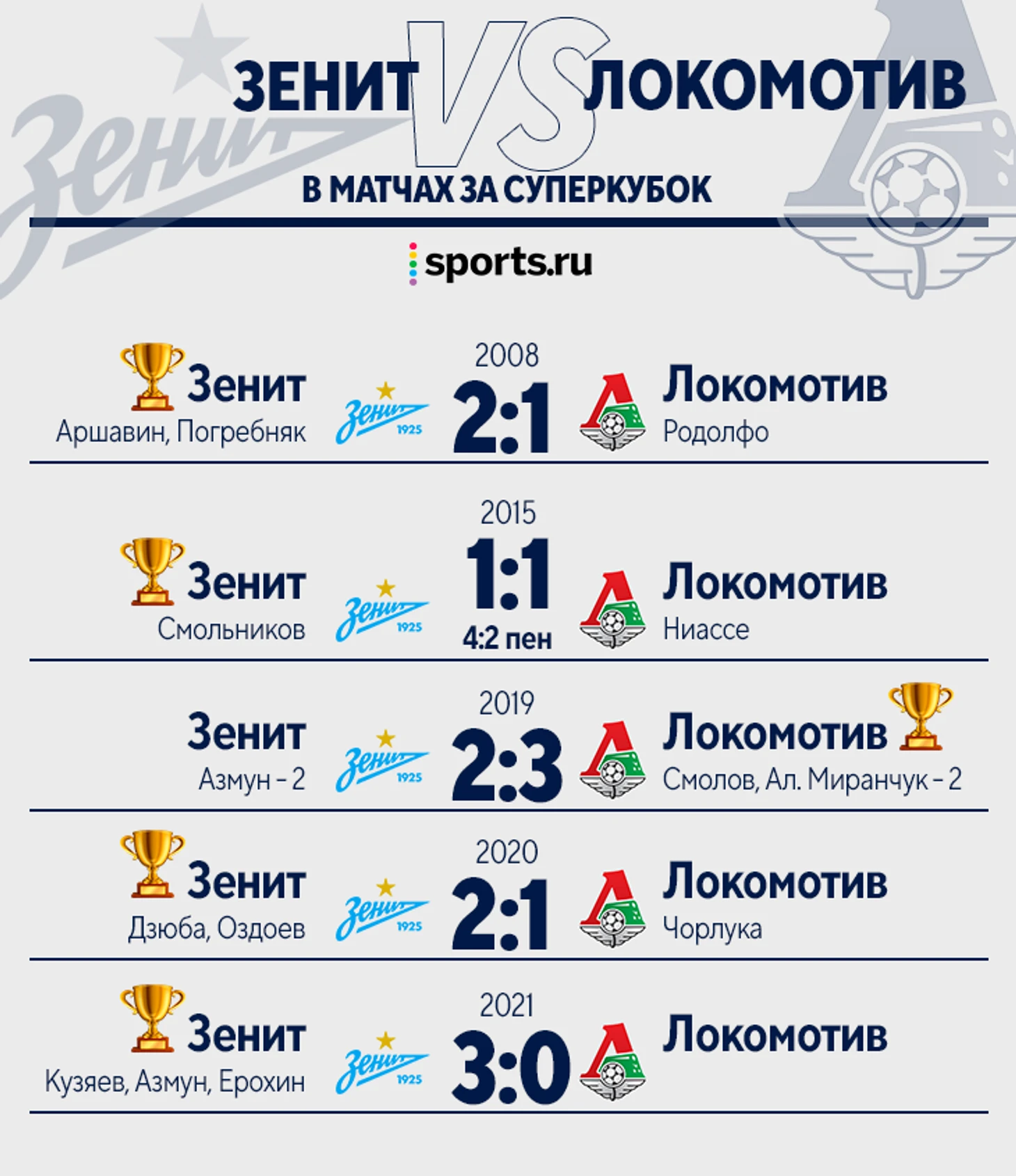 Нынешняя пара в розыгрыше Суперкубка – самый популярный вариант за всю историю розыгрыша: «Зенит» и «Локо» встретились третий раз подряд и пятый вообще. Только одна победа у москвичей, сейчас они сыграли самый неудачный матч.