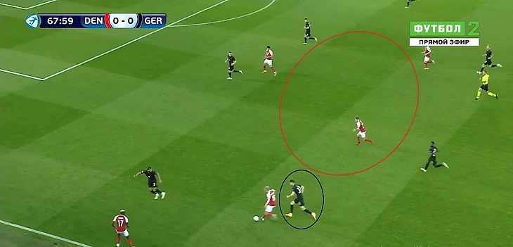 Его отсутствие сказалось в игре с Данией. Заменявший его Стах был менее позиционно дисциплинирован, чем и пользовался соперник – его вытягивали на фланг и отдавали пас ему за спину. Восьмёрки не успевали его страховать, и Дания получала преимущество в зоне перед штрафной. Возможно, поэтому Кунтц решил сыграть надёжнее и перестроил команду на схему в 5-4-1 без мяча уже в дополнительное время.