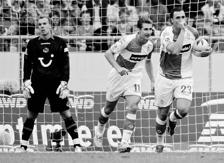 Каждый год Роберт и «Ганновер-96» терпели серьезные поражения от бременского «Вердера». Бременские игроки Мирослав Клозе (слева) и Уго Алмейда празднуют свой последний блестящий ход.