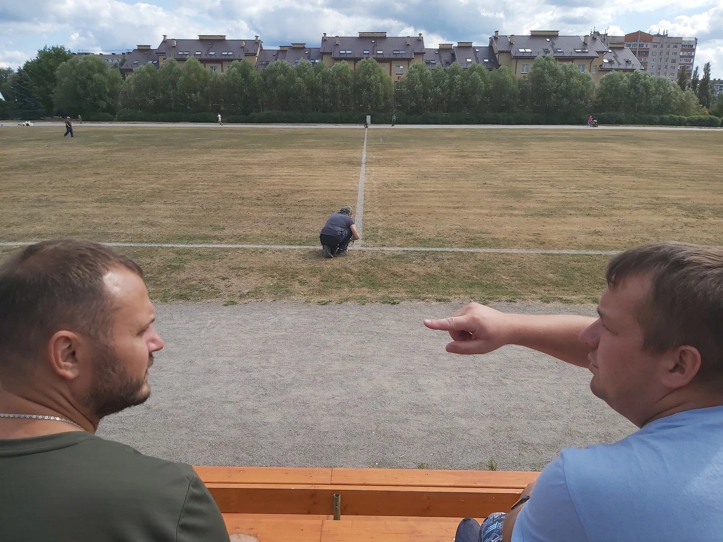 К шести часам вечера девственно чистый прямоугольник футбольного поля с высохшей от знойного лета травой должен соответствовать всем общепринятым футбольным стандартам. Так, изучив изложенную на листе А4 схему и вооружившись необходимой для нанесения разметки техникой, работа на стадионе закипела.