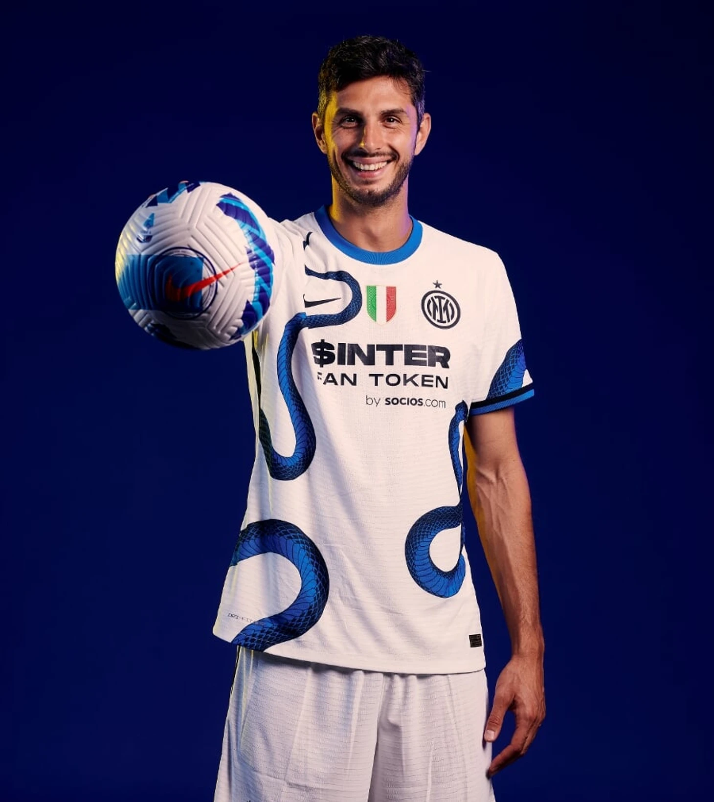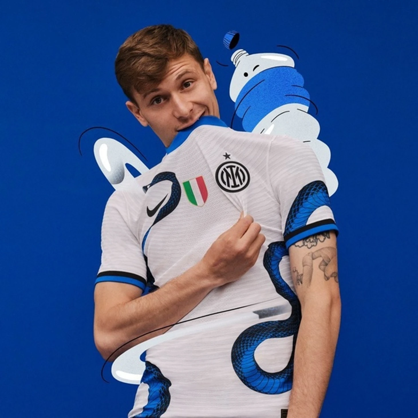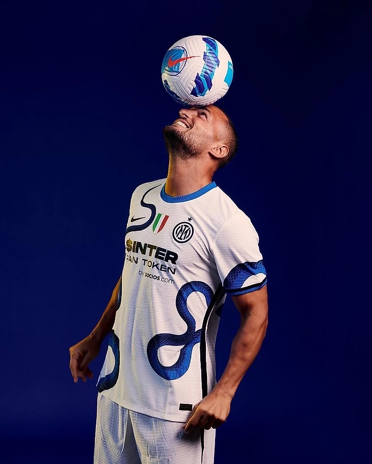 Форма выдержана в той же змеиной теме, что и домашняя, отдавая дань традициям черно-синих. Выездной цвет уже привычно для миланцев остается белым, а по всей футболке "ползет" черно-синяя змея (одно из прозвищ клуба - змеи). Между значком Nike и новой эмблемой Интера гордо стоит итальянский флаг (такой носит действующий чемпион Серии А), а чуть ниже расположен главный спонсор миланского клуба блокчейн приложение Socios, который спустя 27 лет сместил Pirelli с футболки Интера. На задней части футболке будет уже не новый спонсор Lenovo.