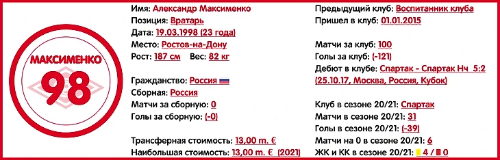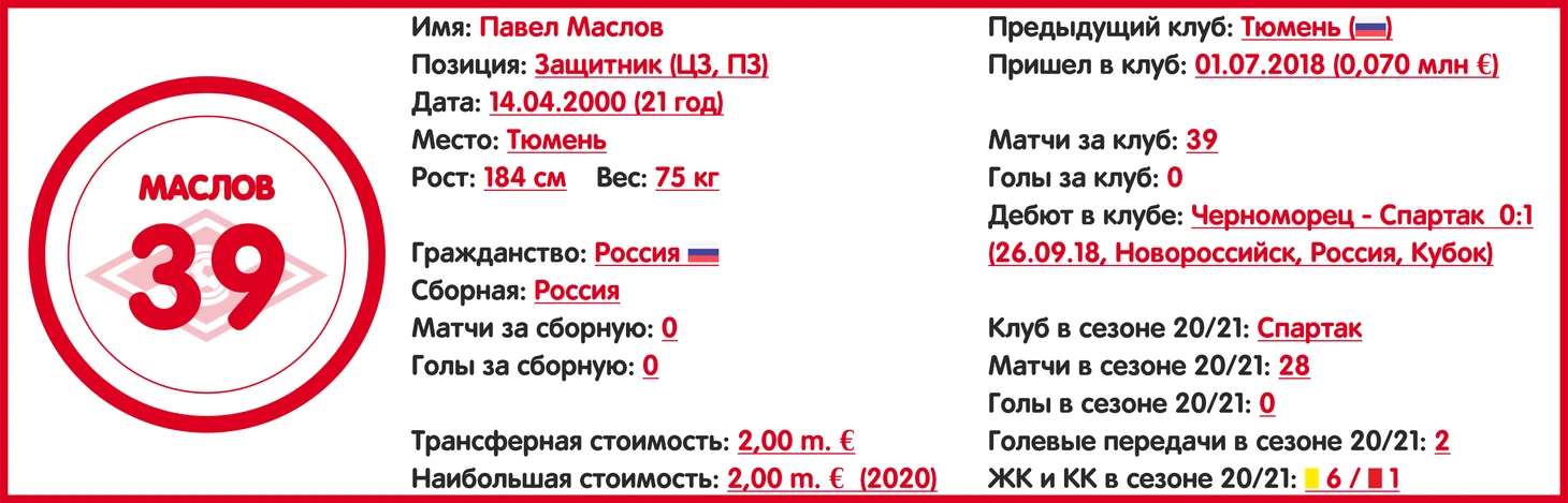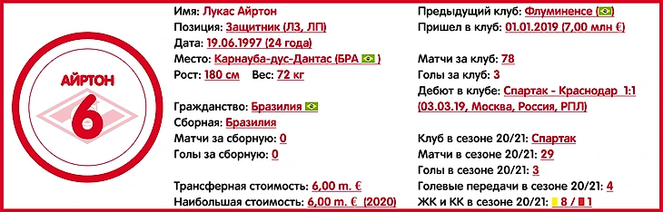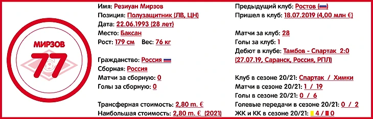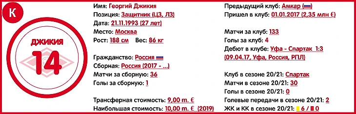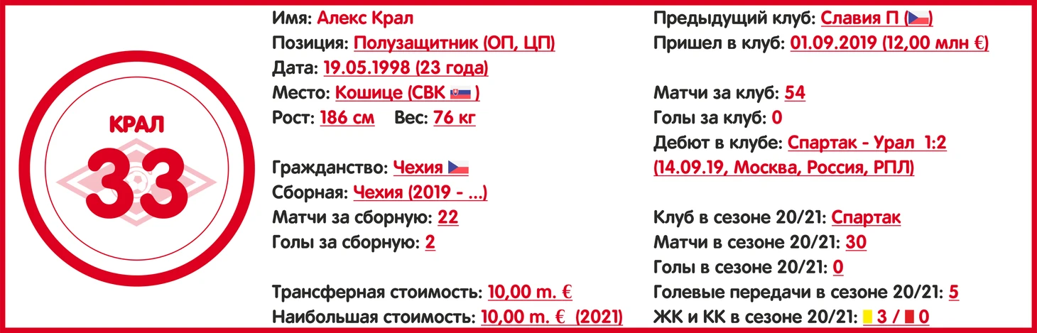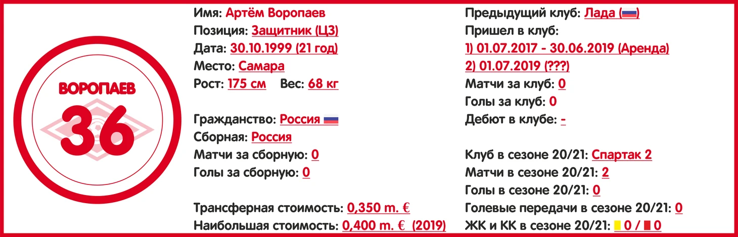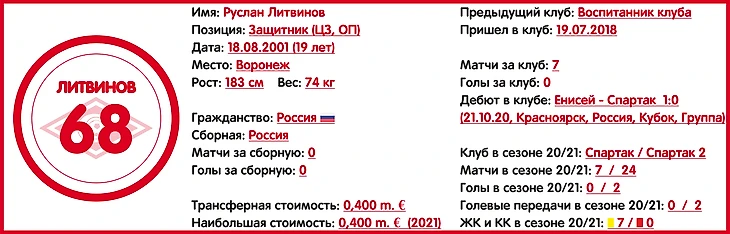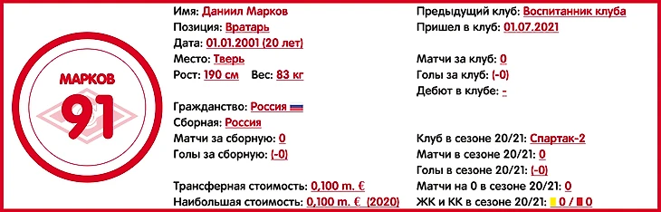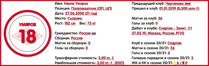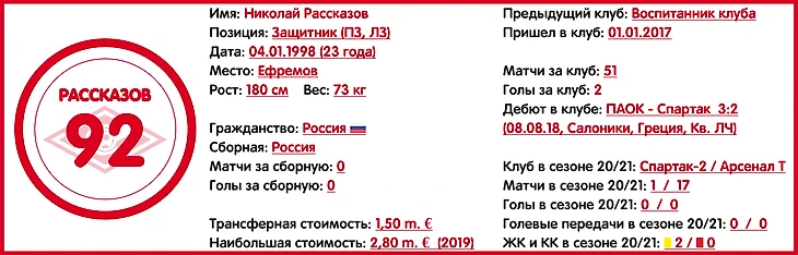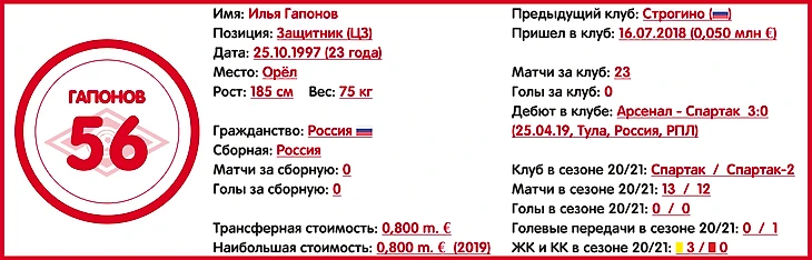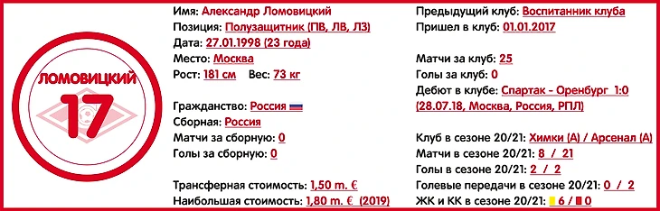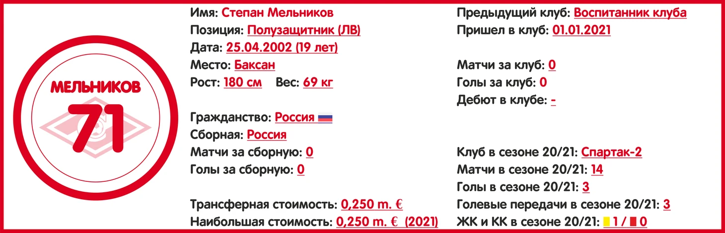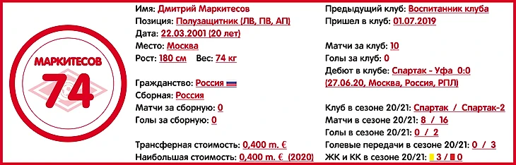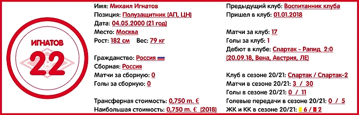 • Привлекался главным тренером «Спартака» к тренировочным сборам основной команды и даже несколько раз выходил в товарищеских встречах, а значит есть все шансы увидеть этого цепкого и трудолюбивого игрока и в играх РПЛ этого сезоне.