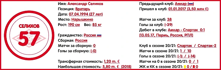 • Его тезка Селихов мог бы попытаться навязать борьбу за пост номер один, однако, к большому сожалению, снова получил травму (в матче против тех же казанцев на кубке «Матч-Премьер» он получил сложный перелом пальца руки и старт сезона теперь точно пропусти).