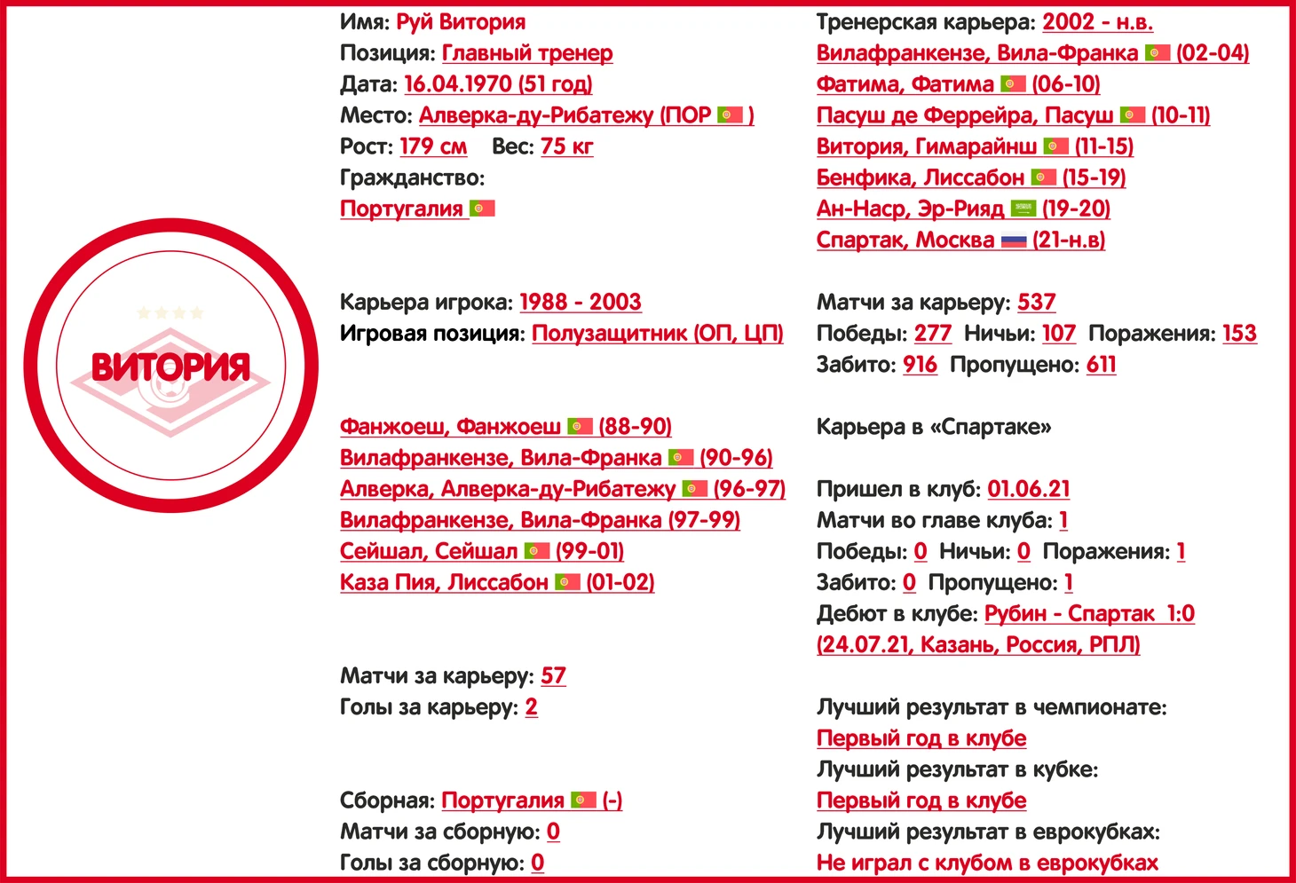 • Ну а летом этого года Руй Витория был представлен руководством московского «Спартака» как новый главный тренер команды, пришедший на смену Доменико Тедеско.