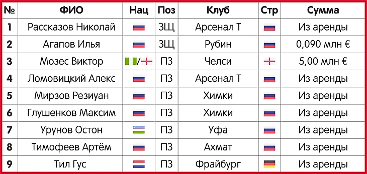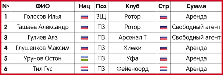 • Свободными агентами ушли и не проходившие в состав Аяз Гулиев (в тульский «Арсенал») и Александр Ташаев (в волгоградский «Ротор»), а ещё один полузащитник команды Артем Тимофеев вроде бы должен на днях перейти в грозненский «Ахмат», за который и выступал в прошлом сезоне на правах аренды.