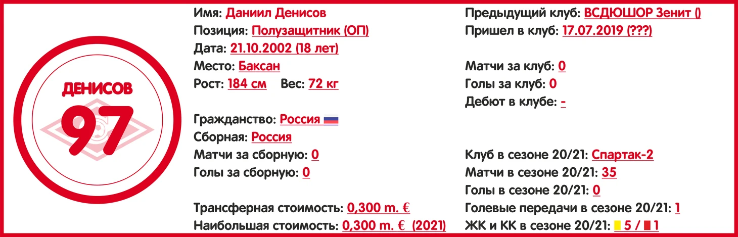 • Молодой опорный полузащитник Даниил Денисов, который перешел в московский «Спартак» из СДЮШОРа питерского «Зенита» является чуть ли не главным игроком в системе «Спартака-2», за который он провел в минувшем сезоне (34 матча и 1 голевая передача).