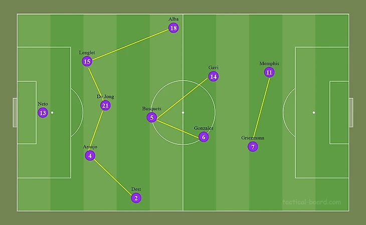 2. С первых минут мы увидели адаптивный ход под соперника - Барселона вышла играть по схеме 5-3-2, что местами напоминало сборную Голландии на Евро-2020. Куман опустил Де Йонга ниже, сделав центральным центральным защитником в тройке. Во второй половине первого тайма голландец иногда поднимался в полузащиту, меняясь позициями с Бускетсом.