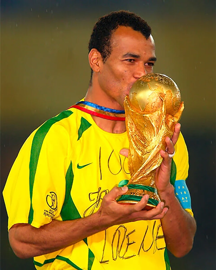 Картинка с поднимающим Кубок мира на шаткой тумбе Кафу – яркое воспоминание того чемпионата. В ней много символизма, присущего бразильцам: любовь к семье («Regina, eu te amo» – послание жене), к дому («100% Jardim Irene» – послание родной фавеле) и к работе (в потрепанной, залитой потом футболке). Этот образ – культовый в Бразилии. Не зря про Кафу часто говорят: «Насквозь бразилец!»