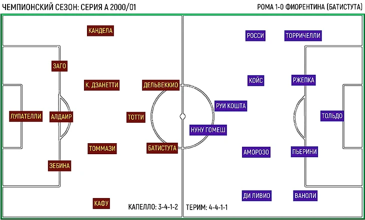 Красота эпохи: две классические десятки на подбрасывании монетки (Тотти и Руи Кошта), аплодисменты от Батистуты прямо у гостевого сектора болельщикам «Фиорентины» до (!) начала матча. Выдающийся победный гол-парабола от аргентинца и слезы Габриэля: как будто сотворил автогол, а не принес победу своей нынешней команде.