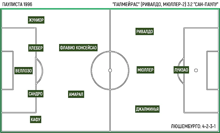 В марте 1996 года Кафу проводит один из лучших матчей в карьере (победа 6:0 над «Сантосом»): «Те «Палмейрас» с Ривалдо, Джалминьей и Роке Жуниором… Многих из них я встречал позднее в Селесао. Эту команду было не остановить, мы забили более 100 голов менее чем за 6 месяцев. Незабываемые времена». Итог: 102 гола, 27 побед, 2 ничьи и 1 поражение, разница + 83. Вратарь Веллозо однажды заметил, что несколько раз парнишке, который менял цифры на табло, не хватило табличек. Та команда – часть бразильского фольклора: 6 из 13 игроков, сыгравших в финале ЧМ-1998, прошли через «Палмейрас» в период с 1994 по 1996 год.