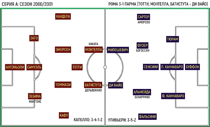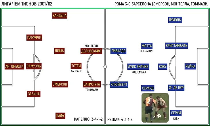 Описание эпохи: Коллина – главный актер матча, в трансляции вставлялись 5-секундные рекламные ролики, 2 петарды у одной штанги вратарской Маркеджани в первые 7 минут, удаление Фавалли на 10-й, Тотти и Несте 21 год. Наибольший пробег за тайм – у пожарного, убирающего многочисленные файеры из штрафной.