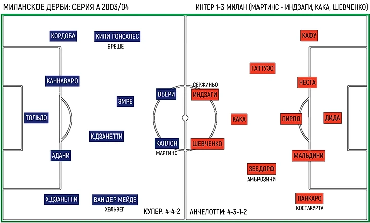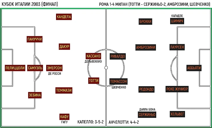 Чуть ли не на первой минуте эффектно прокинул мяч между ног у Серхи (вставка на схеме), однако матч получился из серии, когда у Кафу откровенно не пошла подача, а Кандела был более заметен. Но бразилец любил гнуть свою линию до последнего и чуть сменил акцент в концовке: затяжной рывок на 91-й минуте и не подача, а передача назад и низом, на набегающего Томмази, гол.