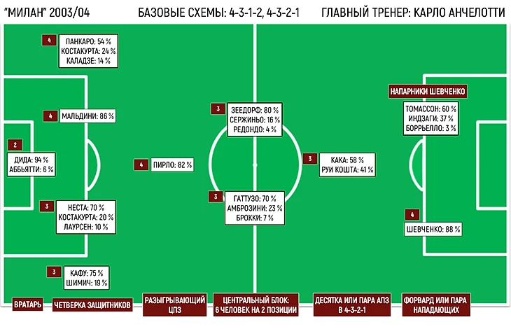 Аналогичное распределение игрового времени по блокам схемы, но уже в чемпионском «Милане»:
