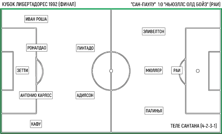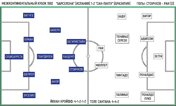 Здесь Кафу – полузащитник, но действующий в связке с другим крайним защитником, Витором. Игра против всей левой части «Барселоны» (Витчге + Бакеро + смещения туда Бегиристайна и реже Стоичкова). Тип матча: игра против владеющей команды с 21-летним Гвардиолой в центре. Блестящие удары Раи и Стоичкова в одну и ту же девятку. Неслучайность победы: за 4 месяца до этого «Сан-Паулу» обыграл «Барселону» в другом турнире – 4:1.