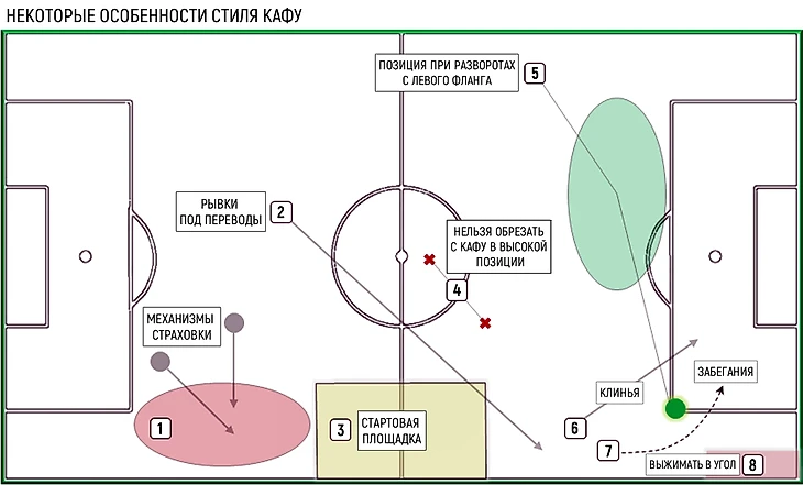 Большинство из указанных на схеме ниже приемов – классика фланговых защитников, но в случае Кафу важны качество исполнения, скорости и объем этих элементов, которые он мог вложить в команду: