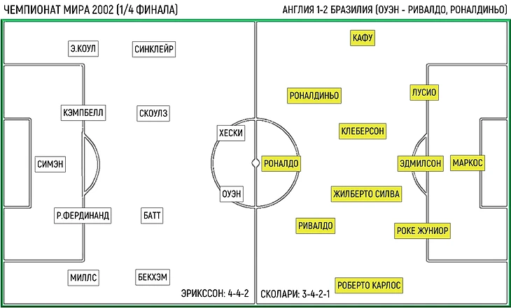 Пик. Схема бразильцев в стиле: «Какой фланг хотите, чтобы вас атаковал? Кафу+Роналдиньо или Роберто Карлос+Ривалдо? Привыкли? Тогда мы поменяем фланги атаки местами».