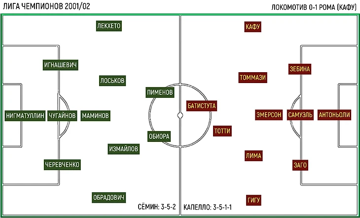 Гол Кафу с подбора после стандарта, не обошлось без рикошета в пользу римлян. 19-летние Измайлов и Пименов, несущая конструкция из Лоськова и Маминова в середине. Помимо гола, привлек внимание такой эпизод с участием Кафу: смещаясь в центр на ведении, бразилец настолько увлекся, что уперся в левого латераля «Ромы» Гигу, отдал ему мяч и забежал за него по левому краю. Мало ему своего фланга, он еще и с чужого мини-момент создал.
