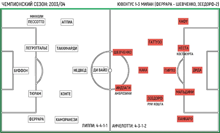 Более консервативная манера от Кафу, что лишний раз доказывает: он не был всадником без головы. Приходилось выдерживать много верховой борьбы от Вьери и Саласа. Одним из главных страхующих элементов (правая восьмерка в варианте 4-3-3 Земана, частичное пересечение по территории) выступил Дмитрий Аленичев. «Кафу vs Недвед» становится традицией. Попытки Вьери давить бразильца размерами, особенно при подачах на штангу Кафу.