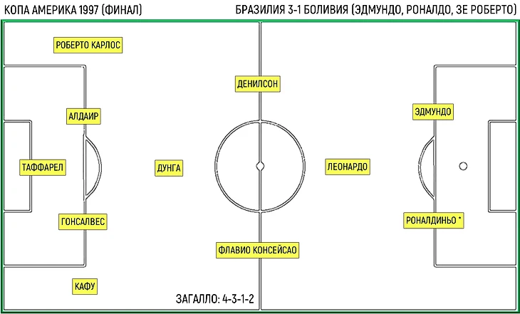 Одна из вариаций классического бразильского «узкого» квадрата в атаке: 19-летний Денилсон (яркая индивидуальность), Леонардо (смещения и связь) и пара нападающих. Роналдиньо со звездочкой – это известный всему миру Роналдо (который «феномен», один из лучших форвардов в истории, еще без груза травм и лишнего веса), просто тогда, в 20 лет, его подписывали именно так. Он не только забил гол, но и поймал такой кураж, что Роберто Карлос уступил ему типично свой, километровый, штрафной (первый гол пришел в результате пристрелки Роберто со скоростью 111 км/ч). Второй форвард – Эдмундо, с говорящим прозвищем «Скотина»: даже в этой игре он ударил боливийца локтем в неигровой ситуации и по современным трактовкам это однозначное удаление и пара матчей прицепом. Мгновенно был заменен от греха подальше.