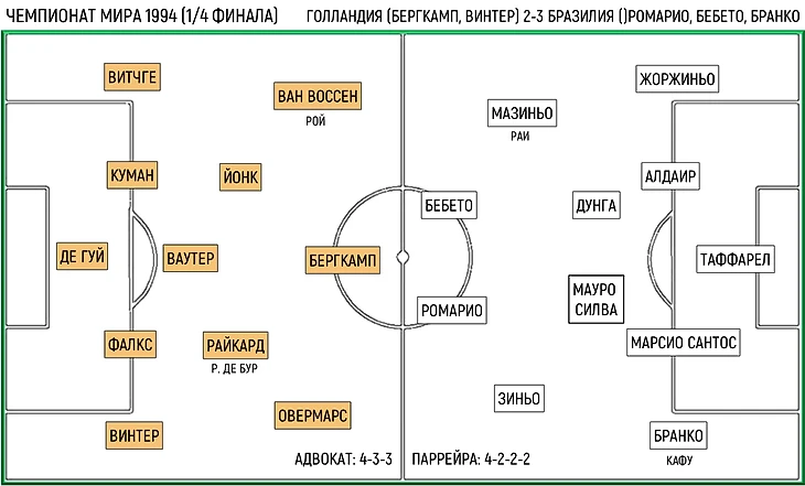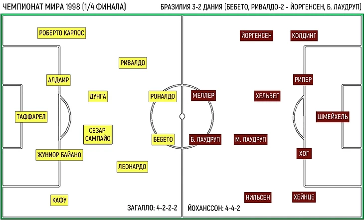 Компоновка узлов исторически значимого квадрата: Ривалдо-Роналдо-Бебето-Леонардо. Цель: открыть бровки, сосредоточить главные силы на центральной оси. Типичный Кафу в концовках: отбор и рывок с мячом на 60 метров вверх по флангу, заработанный важный штрафной. Нетипичный Кафу: при этом же штрафном начал тянуть время, получил желтую карточку сверх лимита и пропустил полуфинал с Голландией (его заменил Зе Карлос). Вернулся только в финале, где все закончилось столь печально.