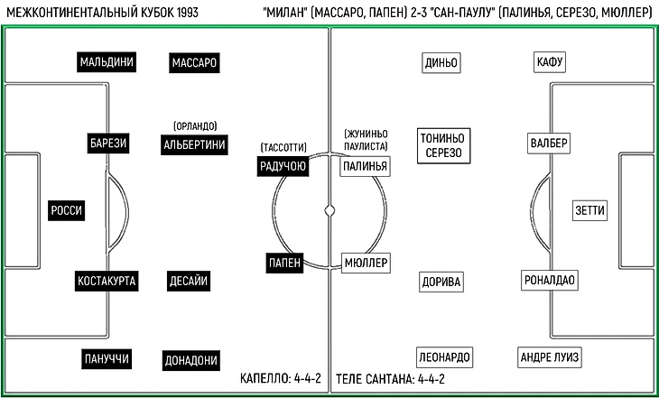 Не сразу понимаешь: Кафу – фланговый защитник или полузащитник? Первая, довольно жесткая, битва с Мальдини на фланге и гол «Сан-Паулу» из этой зоны после голевого прострела Кафу.