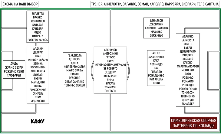 Вы можете собрать любую символическую сборную по любой известной вам схеме. Вплоть до Рожерио Сени + все девять атакующих полузащитников списка с Роналдиньо и Тотти + Роналдо в атаке, а тренером этого безумия сделать Земана. Можете даже выйти за рамки и добавить к имеющимся опциям Омари Тетрадзе и Сергея Гуренко. Или выбрать консервативный вариант: защита «Милана» + атака Бразилии + специи по вкусу. Выбор за вами.