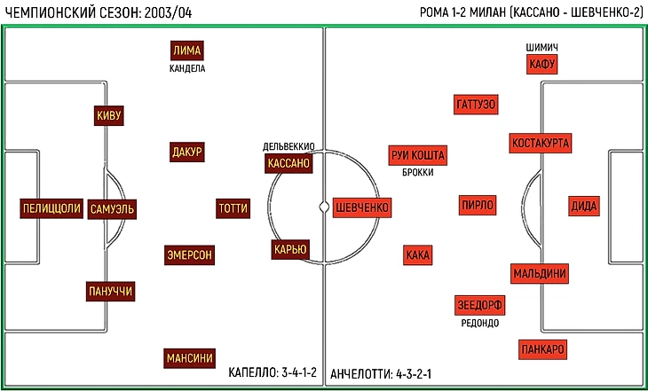 Встреча со старыми друзьями, свист трибун в адрес Кафу: сначала ярковыраженный, затем скорее одиночный. Игра на опыте: в одной из контратак «Ромы» бросает свою позицию и идет в середину в направленный таран, классный срыв контратаки рывком на пересечение наиболее опасной траектории. Посмотрите на этот «Милан» (знаменитая «елка» Анчелотти) – это прекрасно сбалансированная, симметричная команда, здесь и подвигов особых от бразильца не требовалось, каждый занят своим делом. Наконец познакомился с Кандела, а то столько лет бегали на разных флангах.