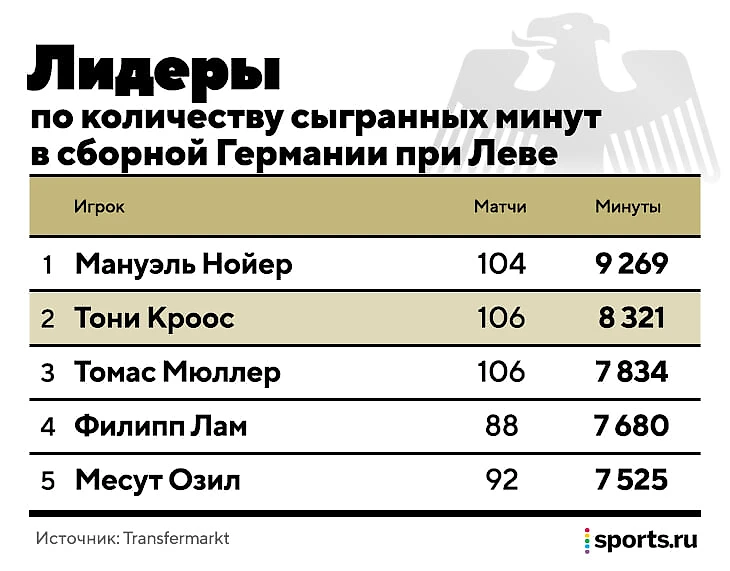 Кроос был важнейшим игроком (с ЧМ-2014 не пропустил ни минуты на крупных турнирах), но всегда оставался в тени. При этом именно на его счету было больше всего передач, от него зависело, как будет играть команда, в каком направлении пойдет следующая атака. По сути Германия (особенно времен позднего Лева) играла в футбол Тони Крооса: надежный и аккуратный.