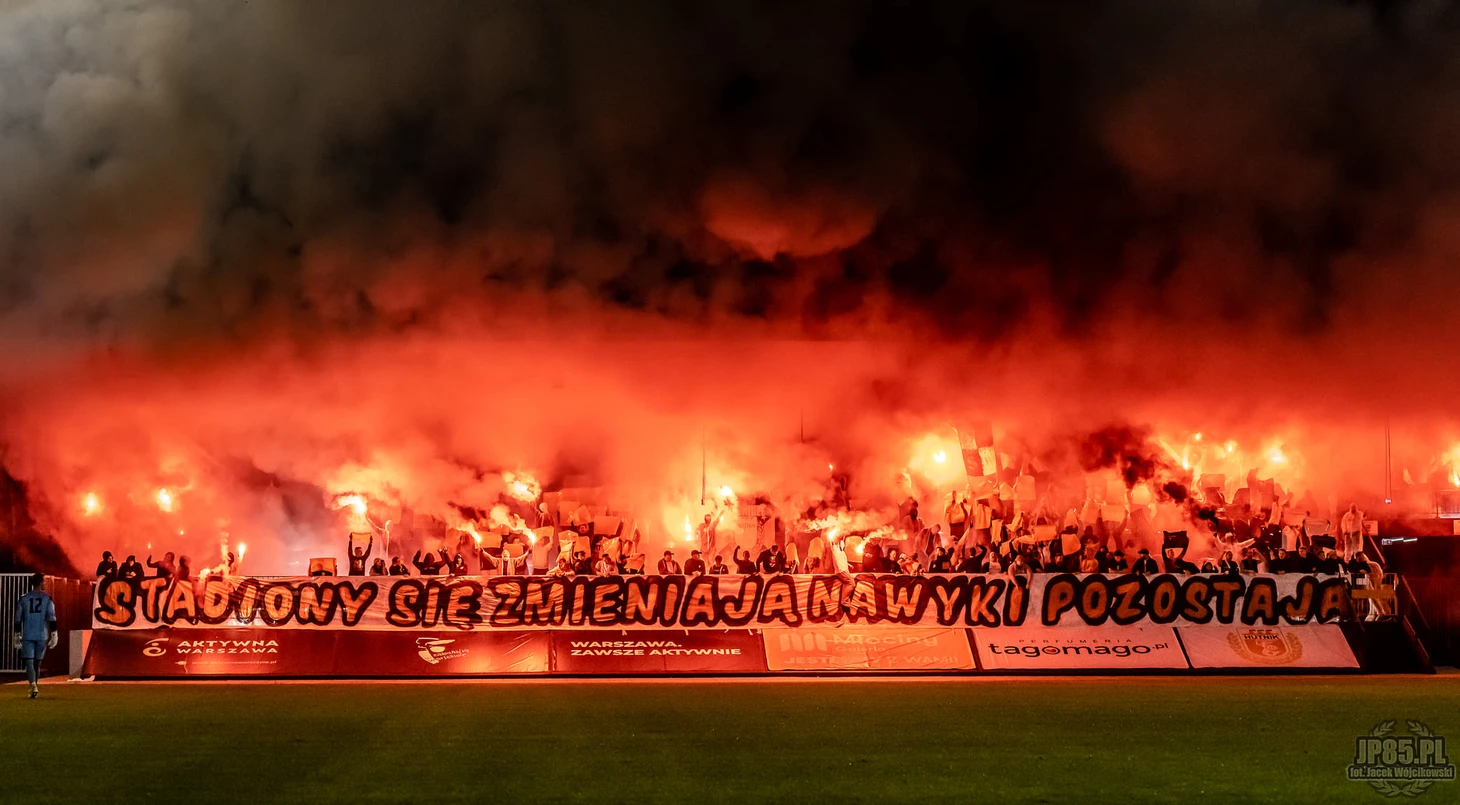 Как раз IV-ая лига. Фанаты варшавского «Хутника» на матч с «Млавянкой» подготовили оправу «Стадионы меняются, навыки остаются», которая в вечернее время за счёт пиротехники выглядела еще лучше.