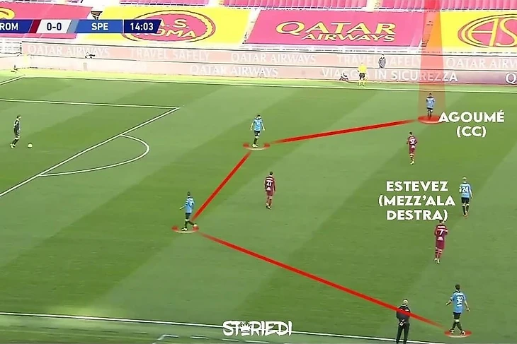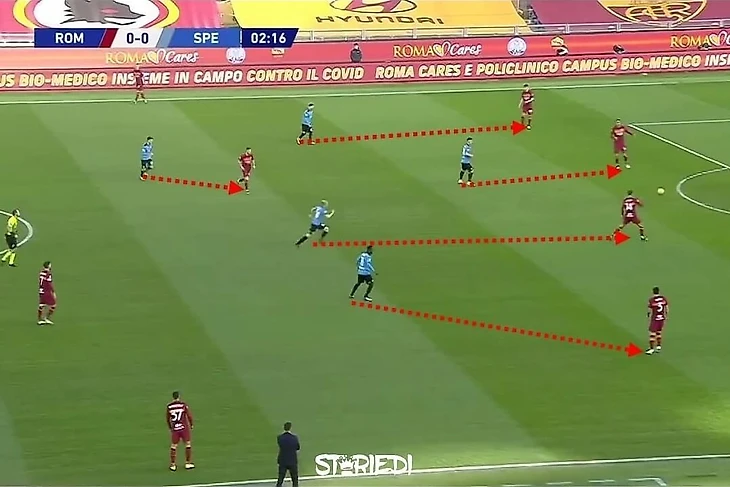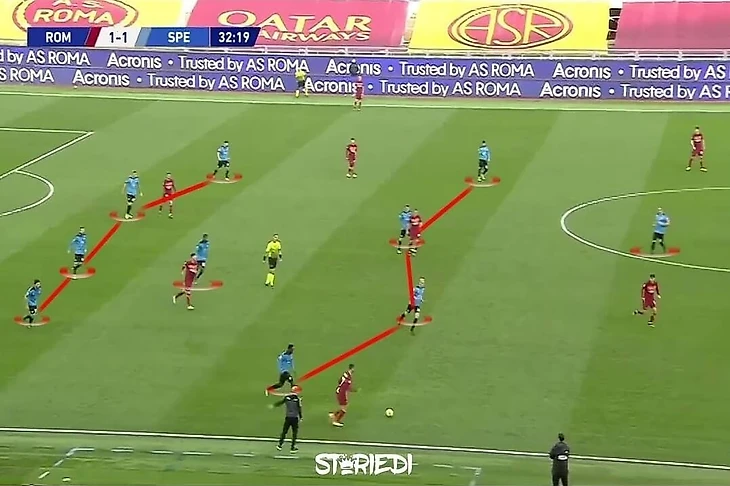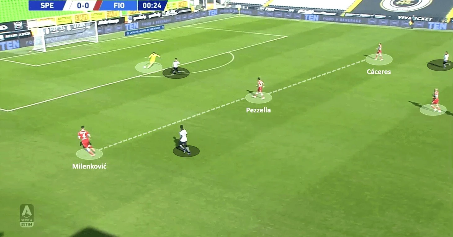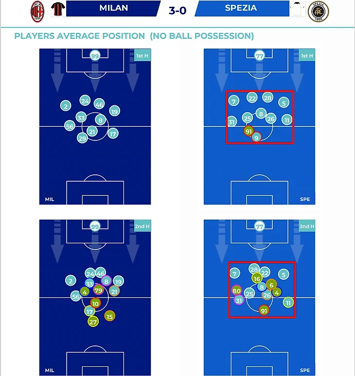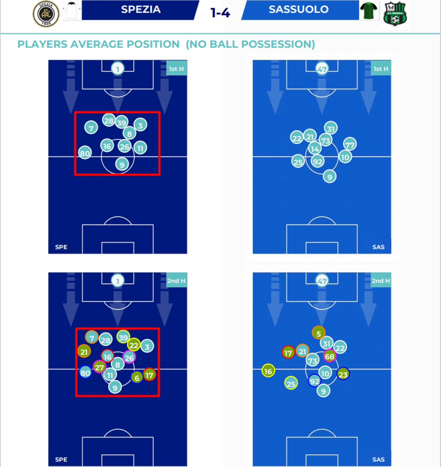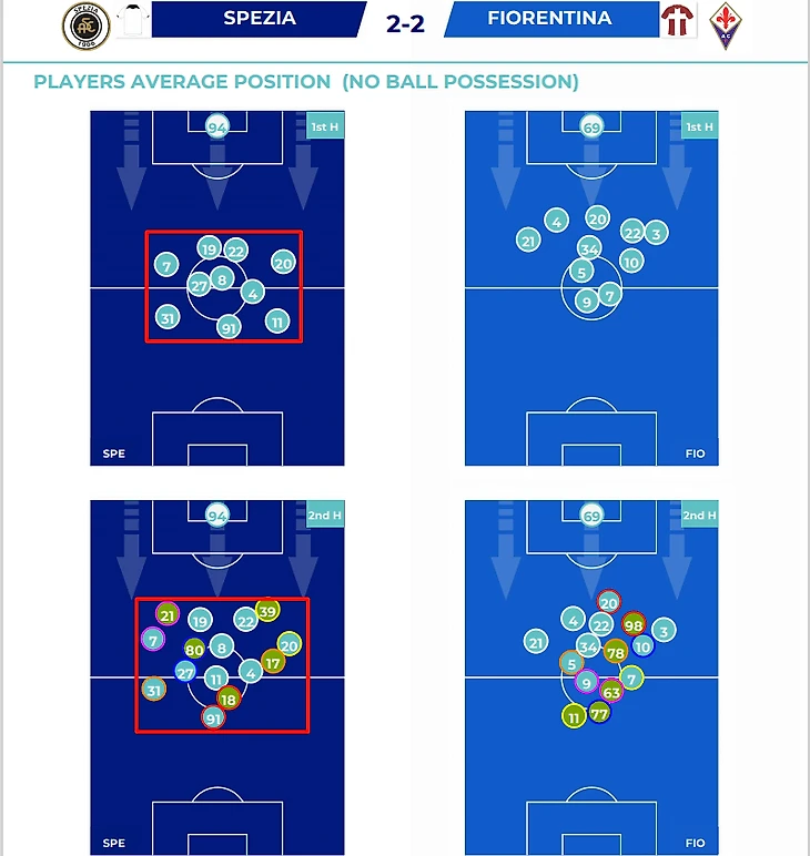 Другим новшеством «Специи» в этой игре стала высокая линия обороны. Чтобы продемонстрировать различия, достаточно посмотреть на средние позиции игроков лигурийцев и их соперников при игре без мяча в матчах первых трёх туров и в игре четвёртого тура против «Фиорентины».