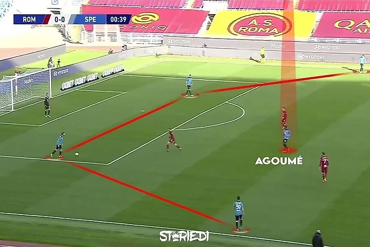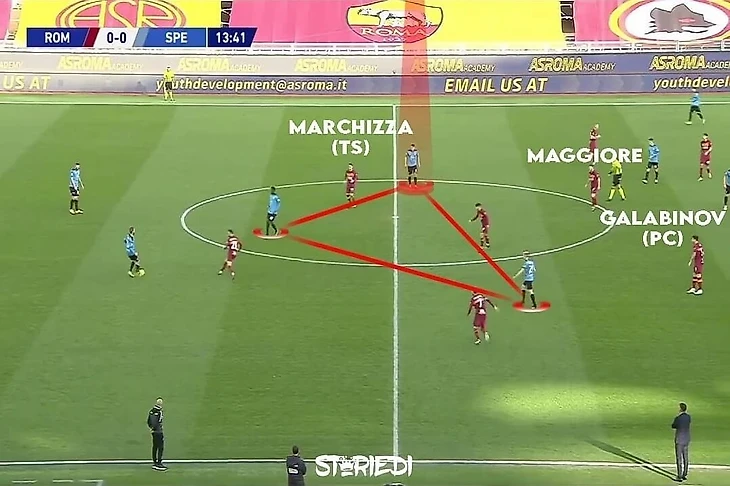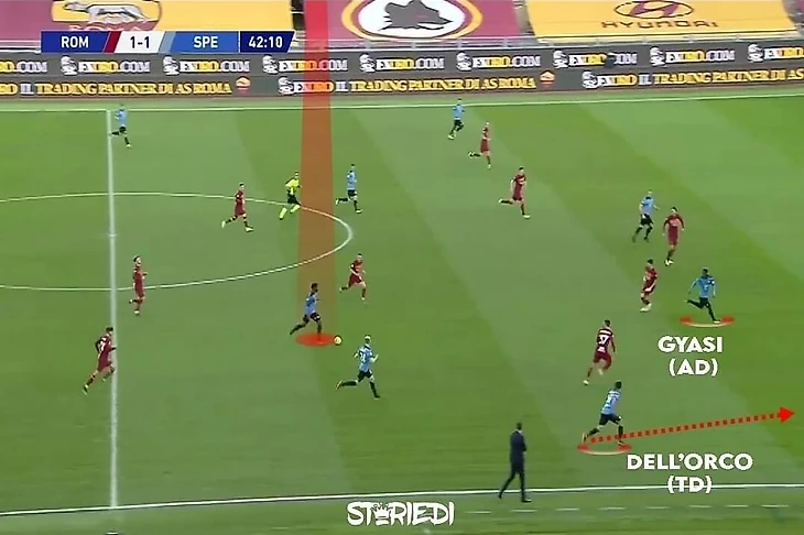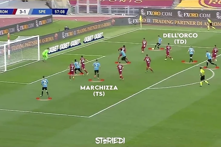 Более четверти голов (14/52) «Специя» забила после фланговых доставок. Игру Итальяно определяет взаимодействие фланговых треугольников, постоянная смена позиций ломает оборону соперника и даёт возможность подавать/простреливать без сопротивления.