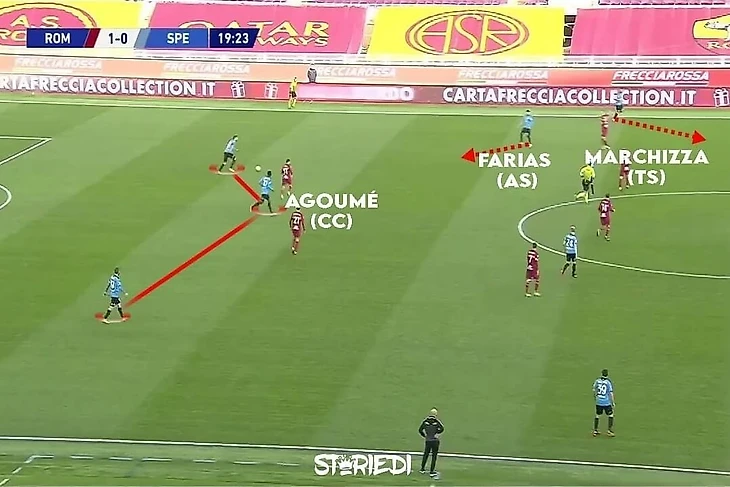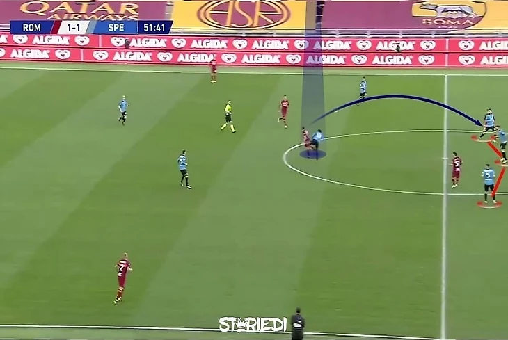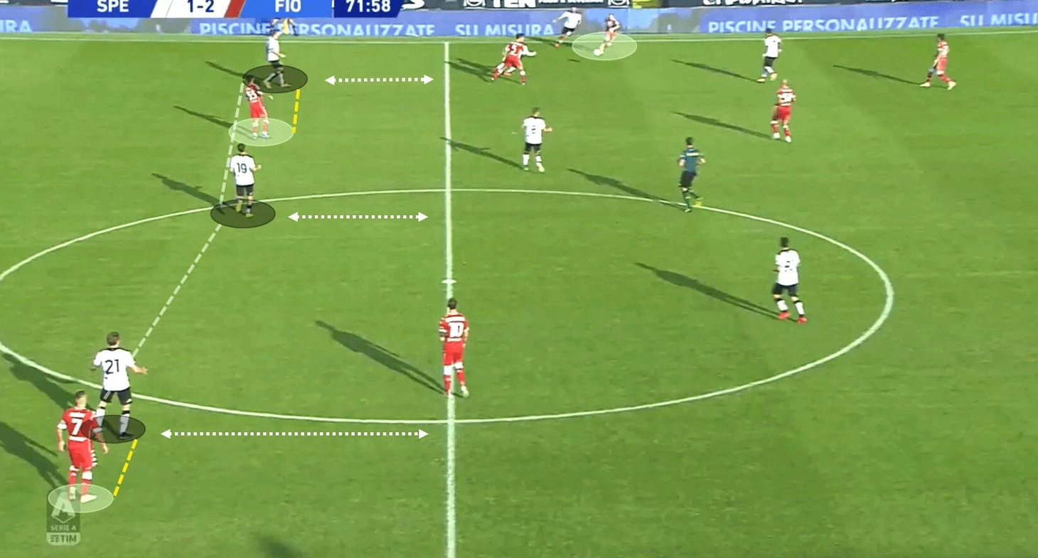 Изначально казалось, что акцент «Специи» на давление в матче с «фиалками» был ходом под конкретную игру: по итогам первых трёх туров лигурийцы уверенно занимали последнее место по интенсивности прессинга (17,73 PPDA), а «Фиорентина» на том отрезке и в целом по сезону плохо справлялась с акцентированным давлением ввиду чрезмерного акцента на фланги без наличия исполнителей должного уровня (Кьеза ушёл в последний день трансферного окна) и отсутствия отработанной структуры владения. В результате в этом матче «Специя» выбила 7,81 PPDA (уровень самых интенсивно прессингующих команд).